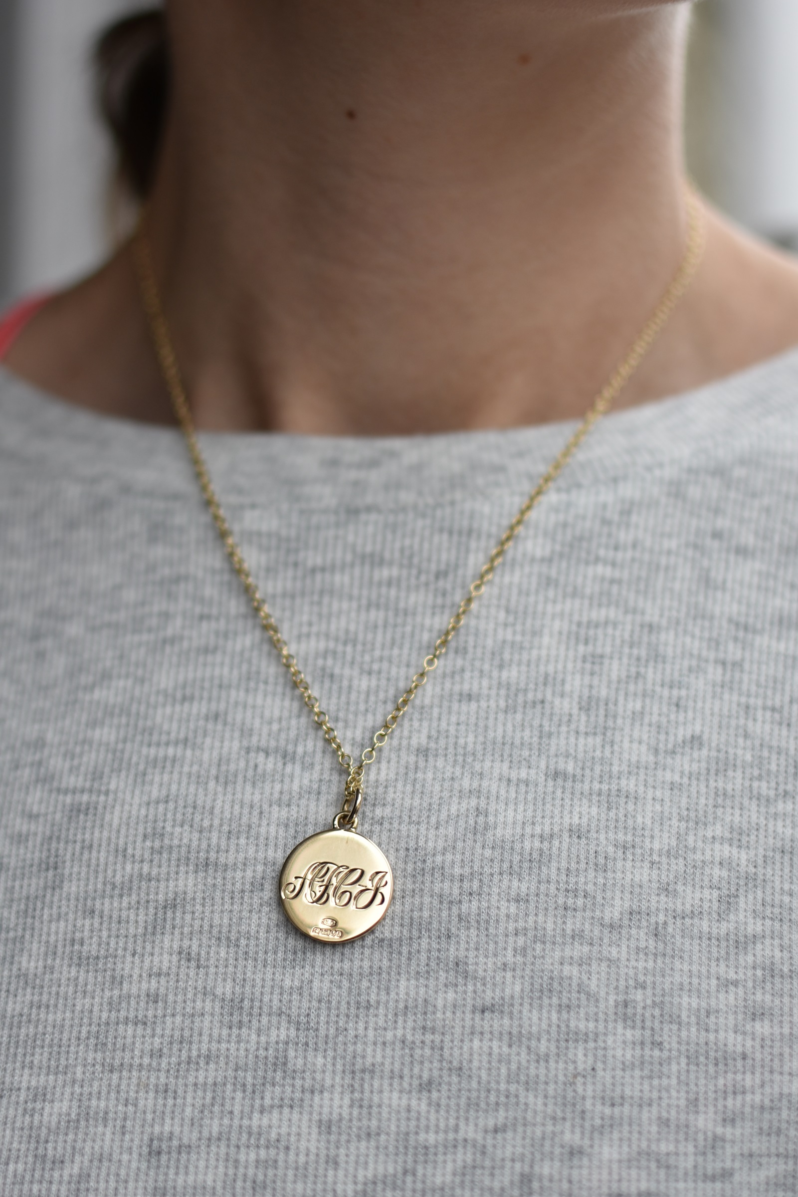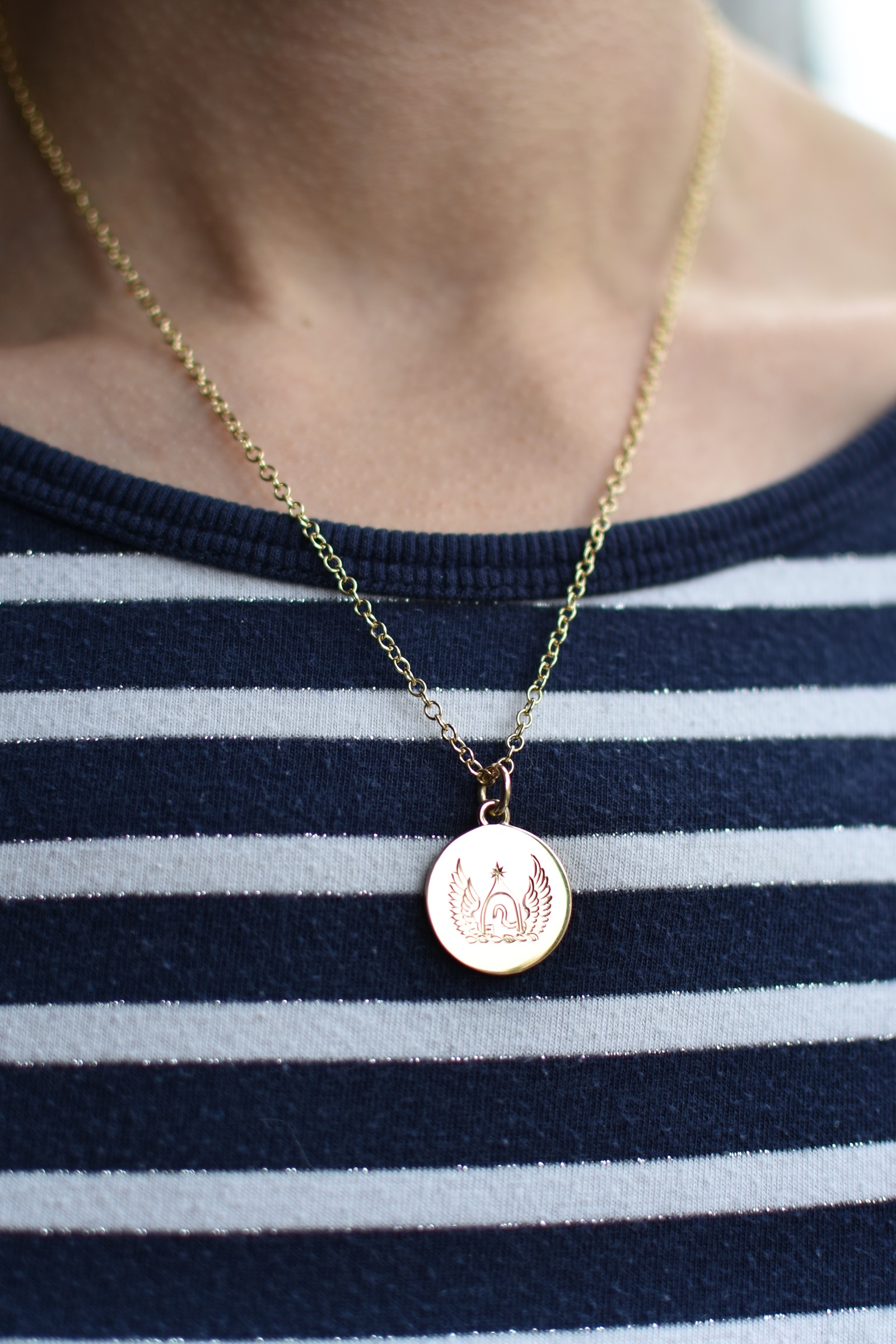 Our popular gold pendant necklaces come with an 18mm diameter solid 9 carat disc deep engraved by hand with a crest or personal design on one side and usually with initials or a date on the other side.  The disc is weighty at 1.5mm thick and is hallmarked at the London Assay office to guarantee the utmost quality.  We can also make in 18 carat gold – call or email me for a quote.