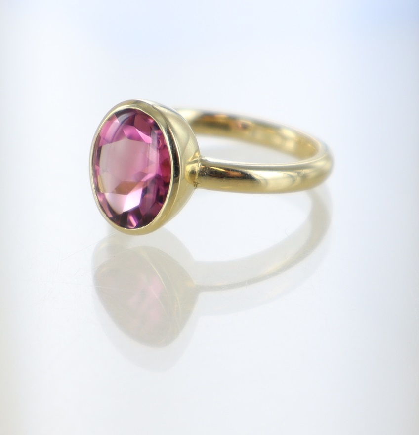 This charming purple ring is handmade in our London workshop. A solid gold band (not gold plated or coated, but 100% gold) in 9 or 18 carat yellow gold is set with the prettiest pink tourmaline. The top of the stone is smooth but underneath is carved to make a facet back, which catches the light and sparkles! The gold is hallmarked at the London Assay Office to certify that it is 9 or 18carat gold.