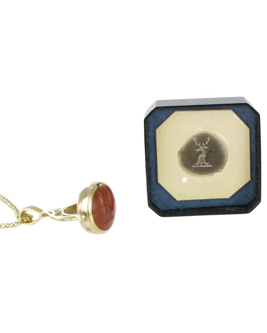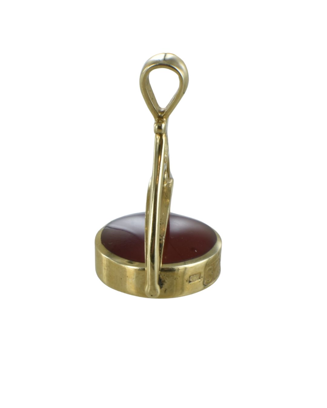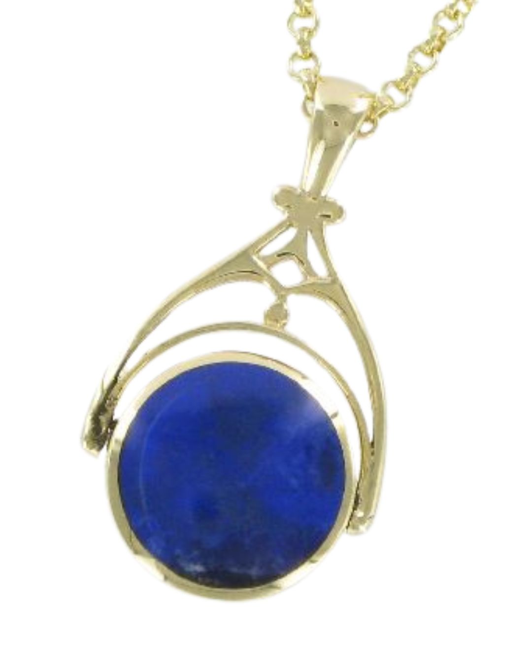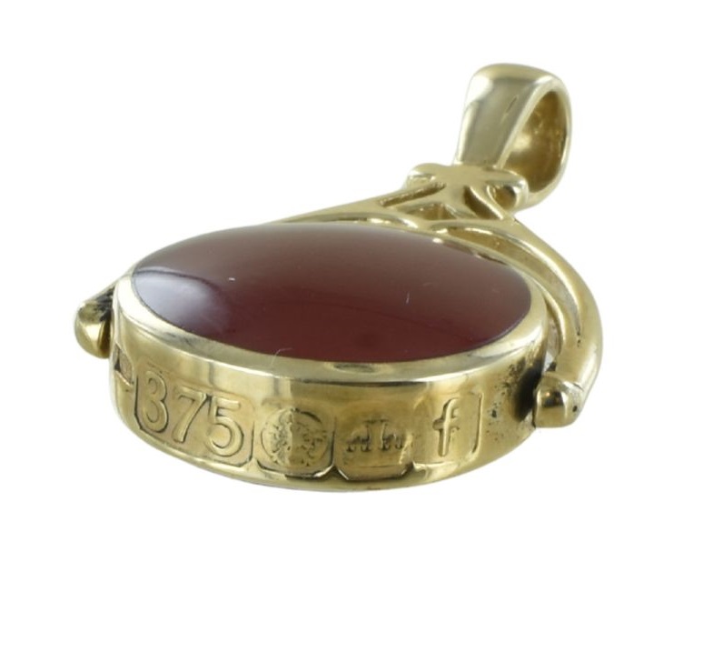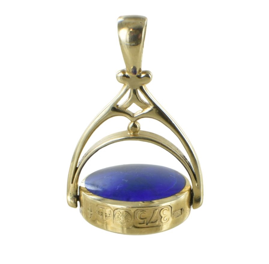 A large circular swivel seal of 18mm diameter featuring a dual setting centrepiece of two back to back 16mm gemstones – a Cornelian one side and a deep blue lapis lazuli on the other. The piece measures 40mm tall incuding the gold swivel bail. The 9 carat gold circular embellishment band swivels the seal stones rotating perfectly so you can show off the cornelian side or lapis stones. The gold band features a very attractive large hallmark design on the base.