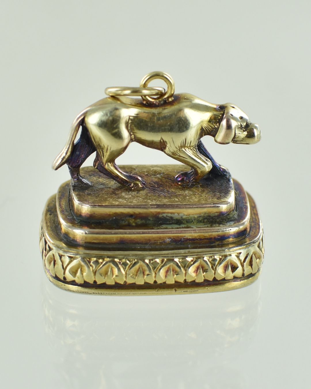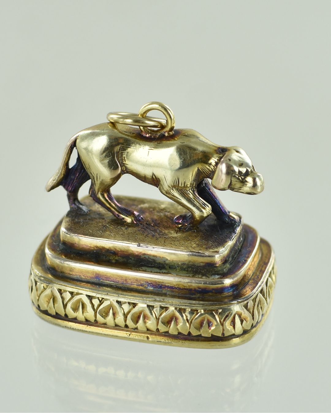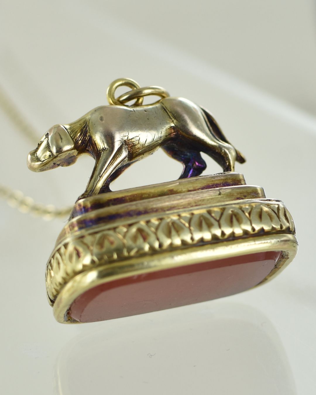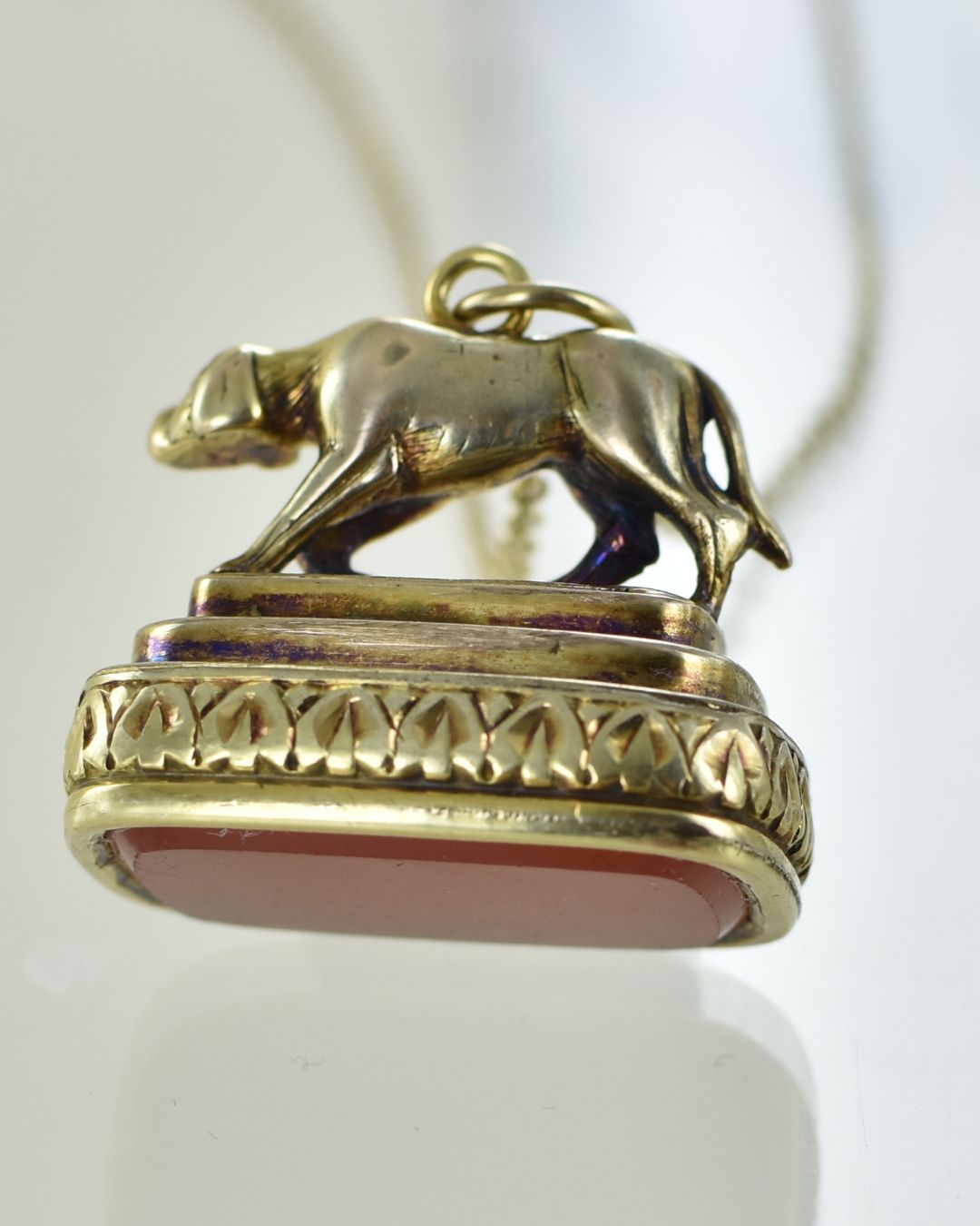 A beautifully formed piece made out of gold plated brass featuring a Labrador or hound. The piece is large and designed with great intricacy and style holding a rectangular cornelian measuring 28mm x 15mm.