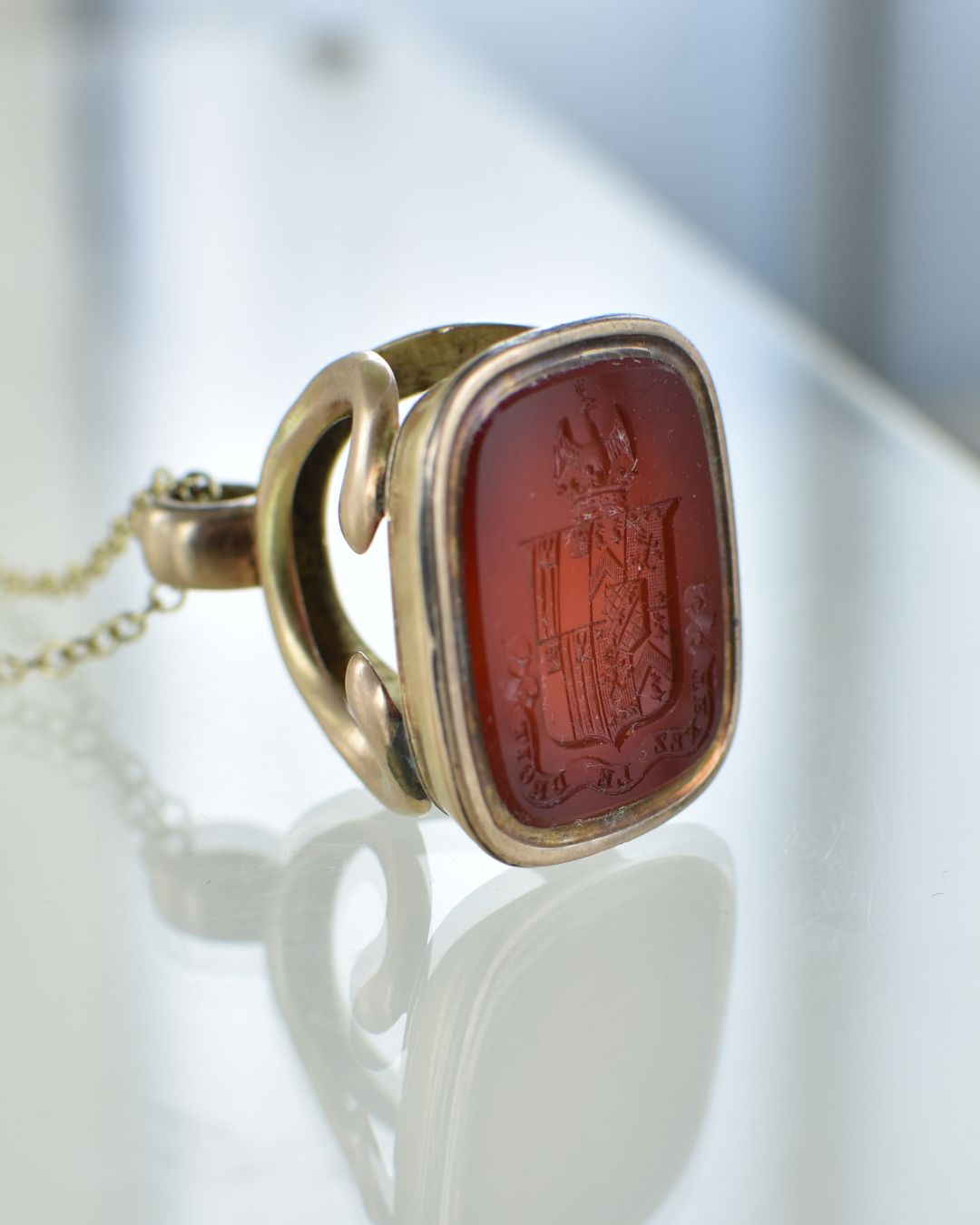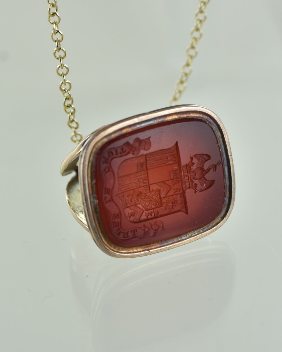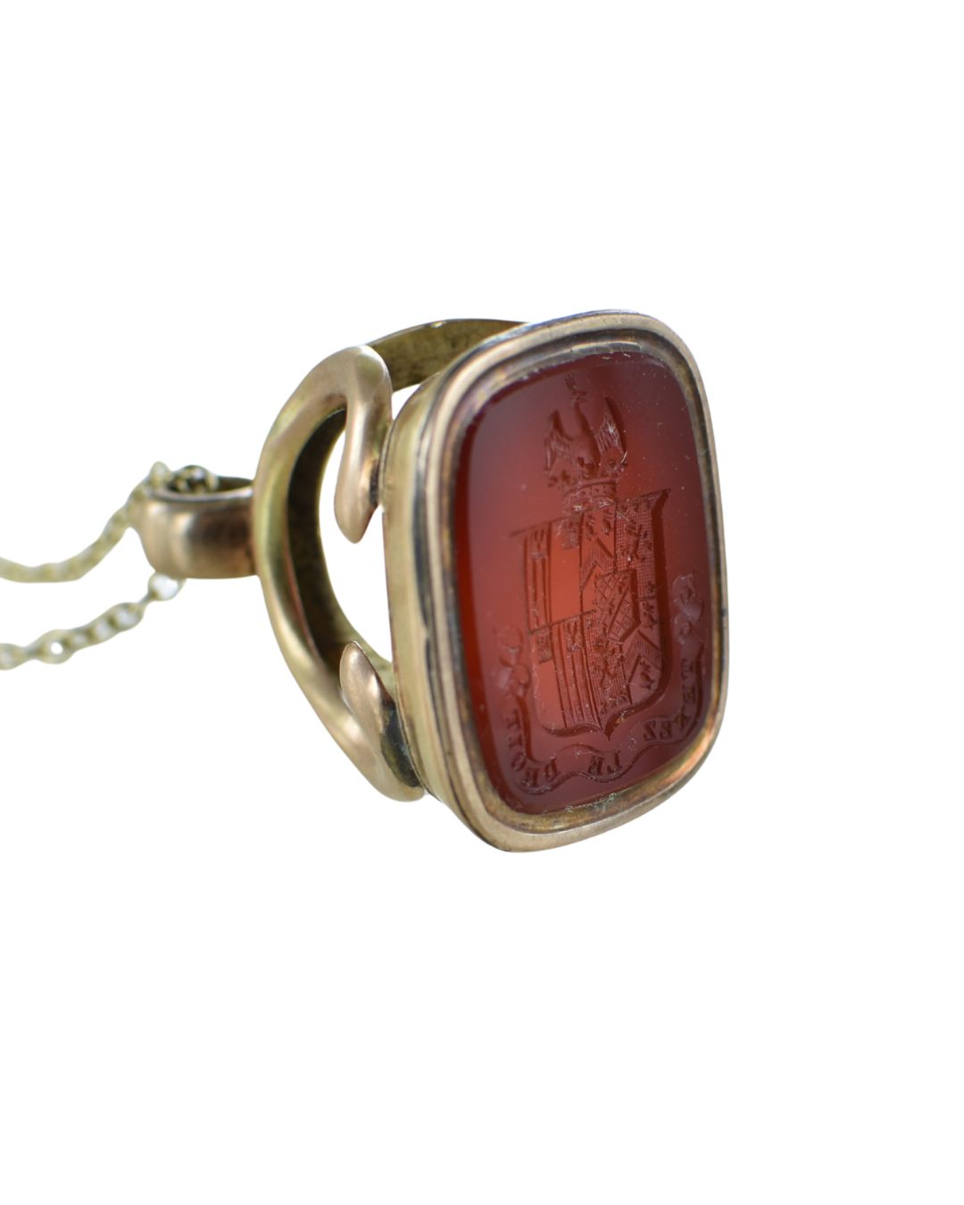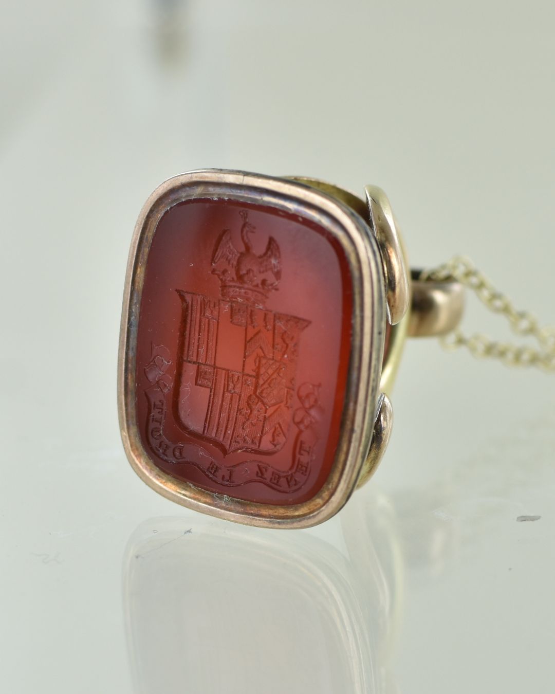 This stunning Victorian Cornelian seal pendant is engraved with a coat of arms and motto. The stone measures 25 x 20 mm with the whole piece standing 40mm tall. Vintage antique piece, probably late Victorian. In good condition.