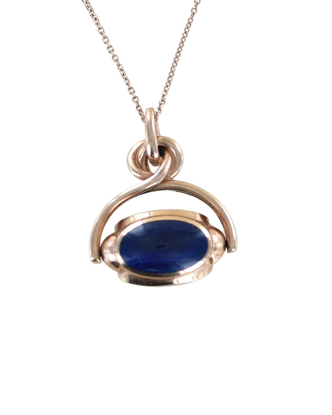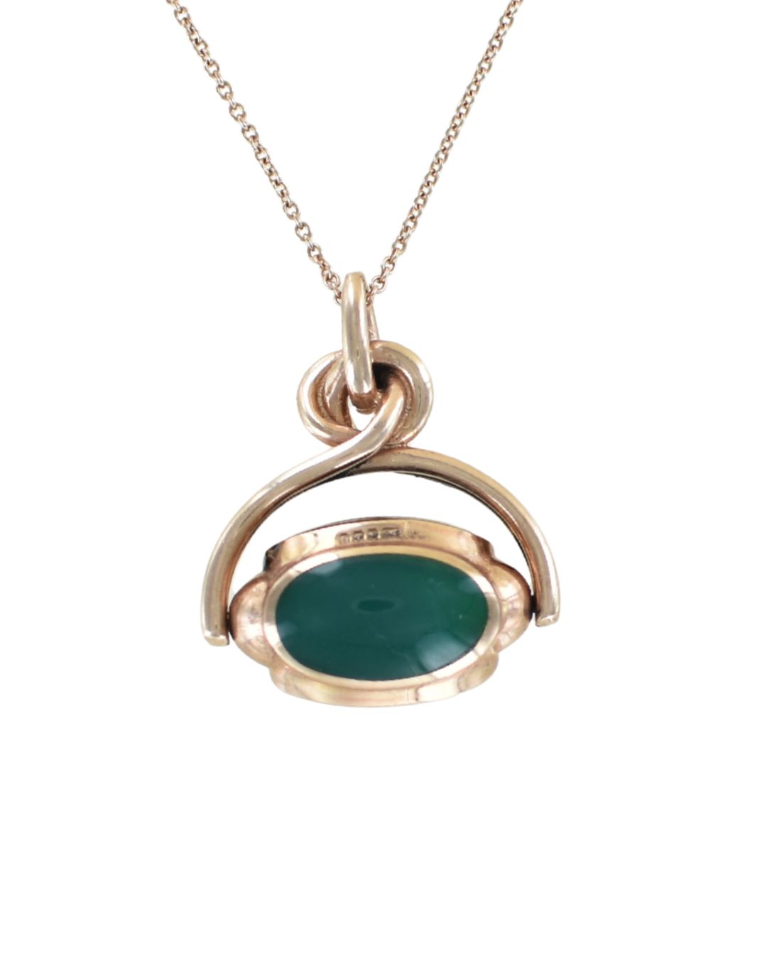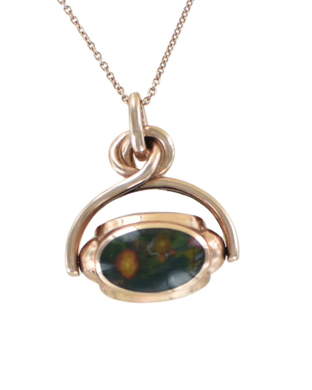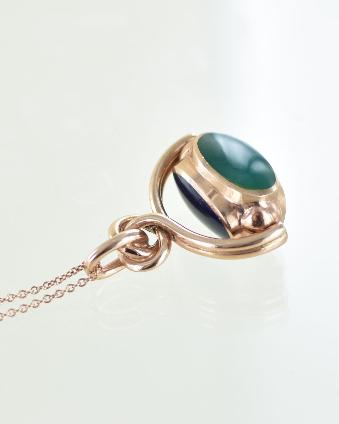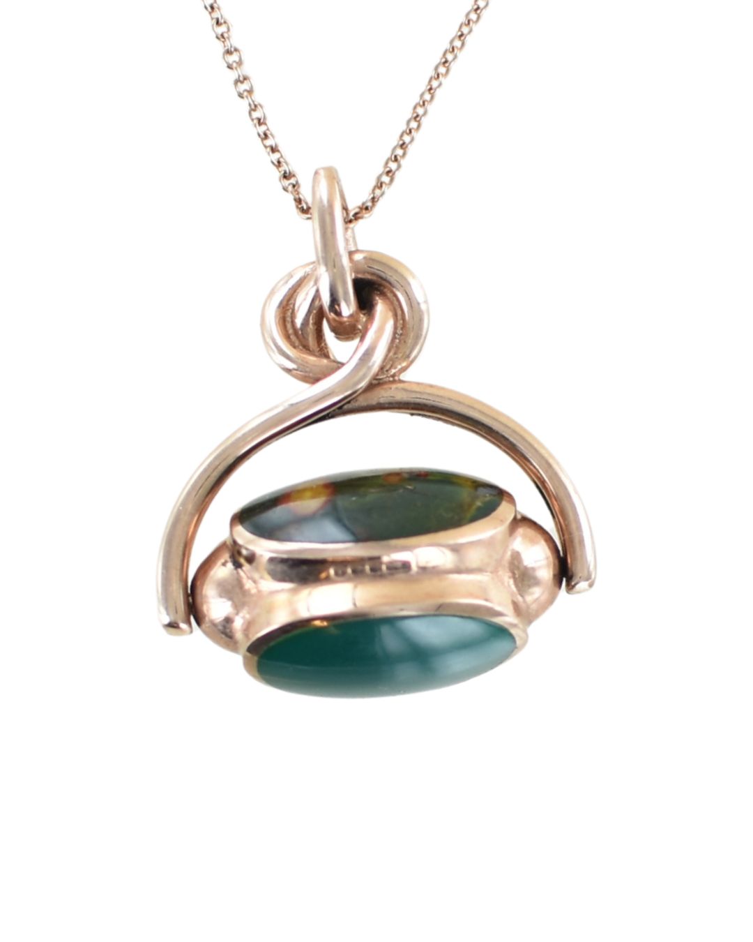 This magnificent and unique swivelling seal pendant features three oval gemstones; blue agate, green agate and a ‘dragon’ bloodstone of olive green and yellow. The bail ring and swivel is made out of beautifully hand crafted, hallmarked 9 carat rose gold. The piece is at least 30 years old but has never been owned or used; it has been in our safe since the early 2000’s.